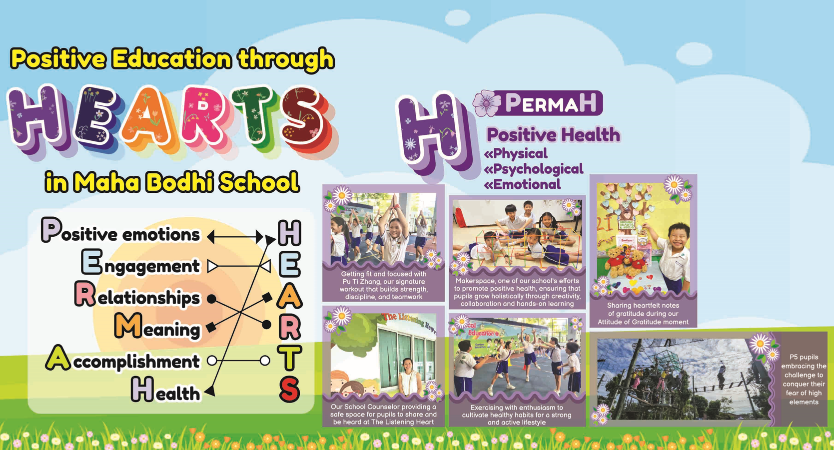 在积极教育理念以及 PERMAH 框架的指引下——即着重培养正向情绪(Positive Emotion)、全心投入(Engagement)、人际关系(Relationships)、生命意义(Meaning)、成就感(Accomplishment)与身心健康(Health)——我们致力于帮助学生培养正念、坚韧力、健康的人际关系,以及均衡的生活方式。